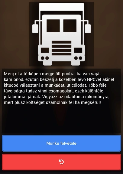 A munka felvételéhez látogassunk el a városházára, ott középen megtaláljuk az "Ügyintéző NPC"-t kattintsunk rá bal klikkel. Keressük meg a Kamionos munkát majd a bal oldal kattintsunk az "Elvállalás" gombra. Ezután megjelenik egy másik menü, ahol kattintsuk a "Munka felvétele" gombra igy elvállalva a munkát.